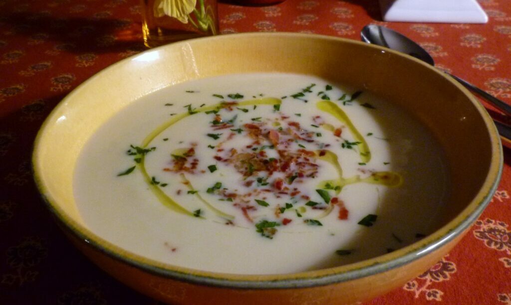 Working in batches, blend the soup until it is smooth. Season the soup with more salt and stir in the crème fraiche. Garnish the soup with a dollop of crème fraiche and hazelnuts.