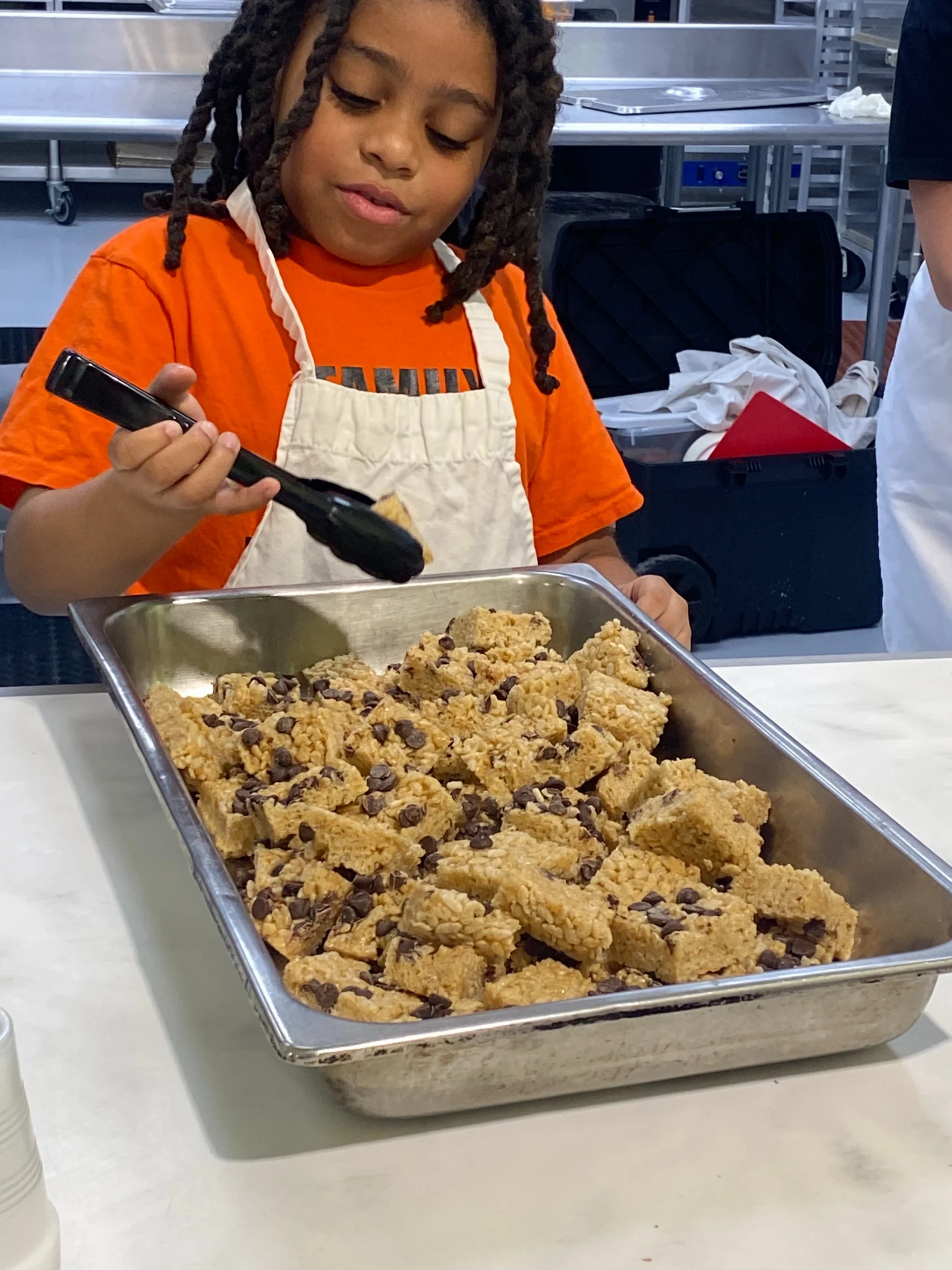 Alongside Chef Educators Sarah and Joe, students help prepare the full dinner from start to finish. Together we’ve cooked Rasta Pasta, Butternut Squash Soup with Grilled Cheese, Baked Mac and Cheese with Roasted Root Vegetables, and a new favorite: Tahini Rice Crispy Treats. As they chop, season, stir, and plate, you can watch skills—and confidence—take shape in real time. Kids swap tips, ask thoughtful questions, encourage classmates, and beam when their dish makes it to the serving table.