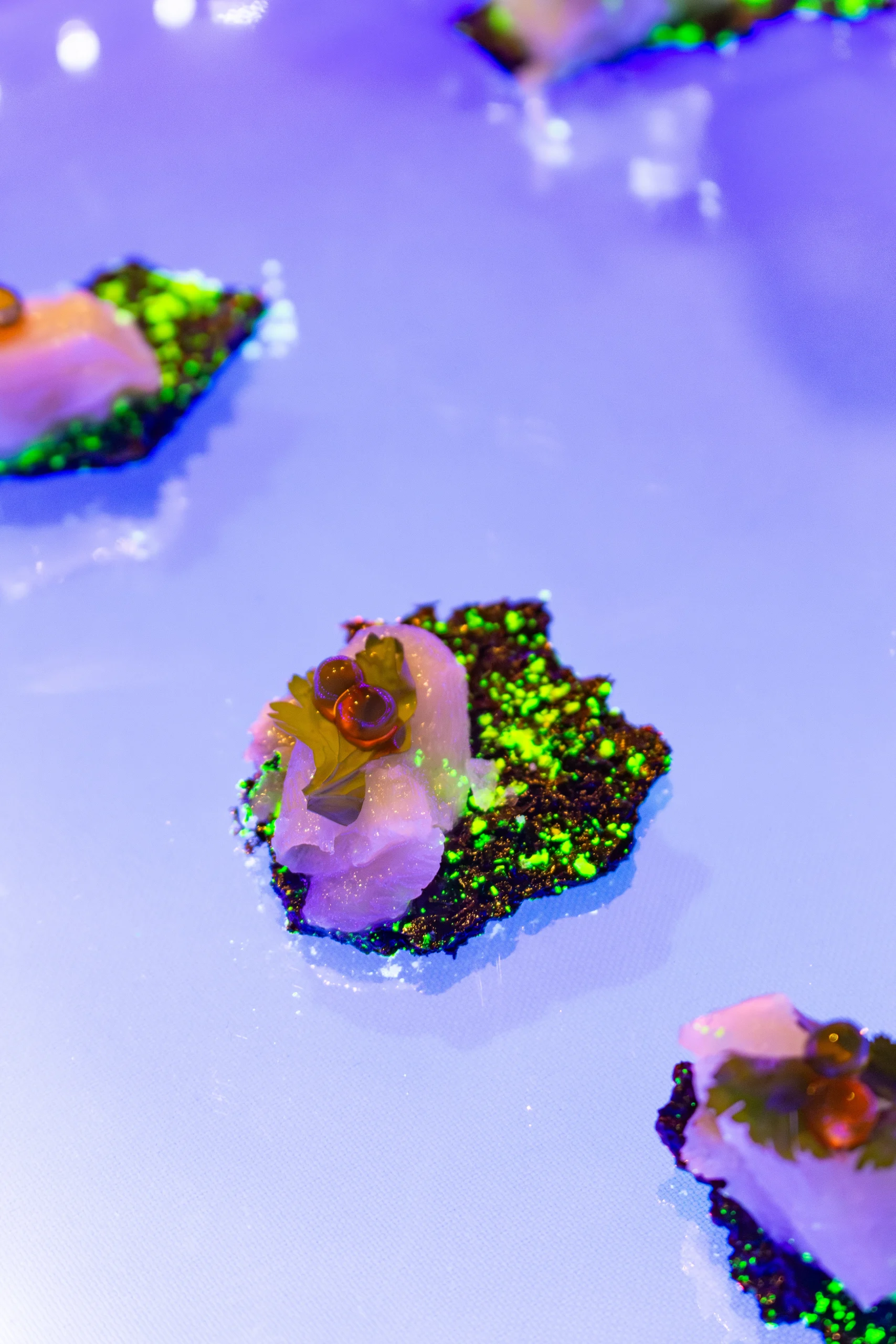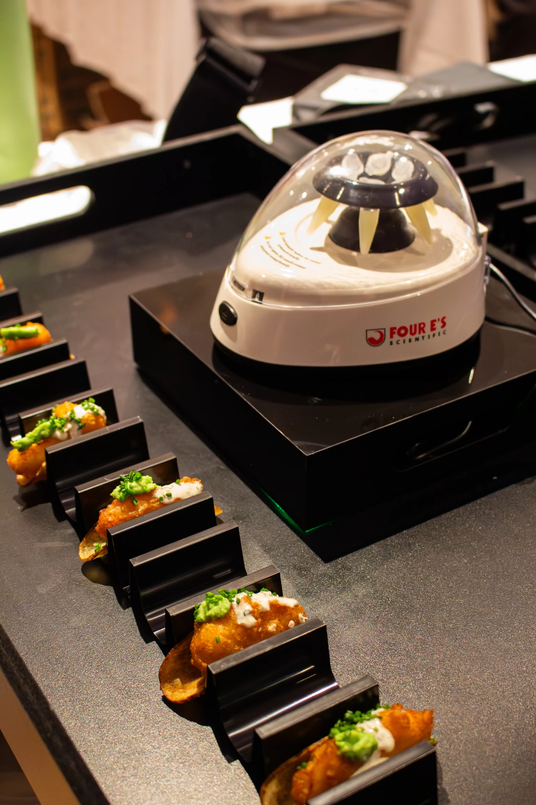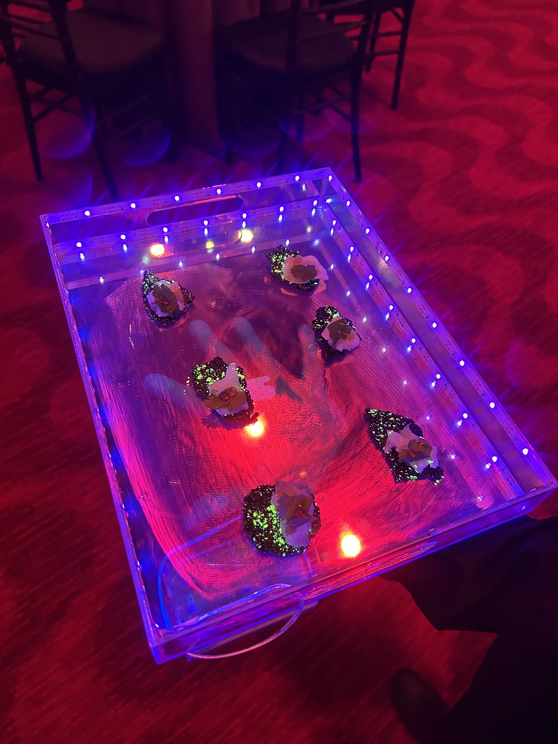 This year our team delivered a menu rooted in creativity and quiet scientific playfulness. Each course carried a subtle element of exploration—textures, temperatures, unexpected contrasts—all served on custom trays chosen specifically for each bite.